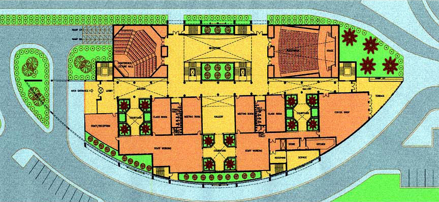 The library design theme reflects the importance of the Literary Collection. It represents the building's different shapes, form design aspects emphasis, the various poetic moods and story telling requirements.